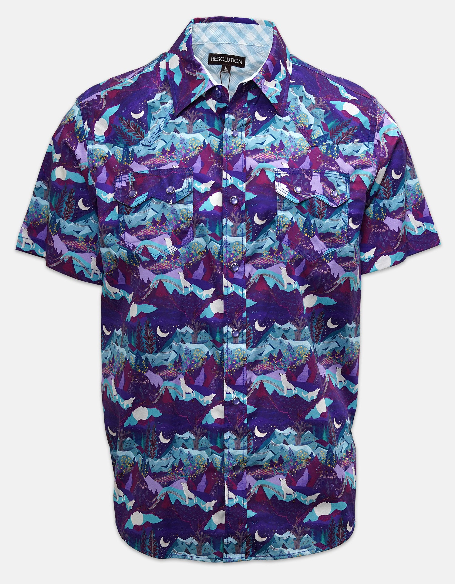- Vibrant Nocturnal Print: A stunning, illustrative design featuring howling wolves and rugged mountain peaks in a rich jewel-toned palette that commands attention.